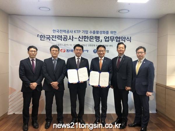 한국전력(대표이사 사장 김종갑)은 10월 17일 신한은행 대기업센터(서울 강남 소재)에서 신한은행과「한전 수출보증브랜드 인증기업(KTP:KEPCO Trusted Partners) 수출활성화를 위한 업무협약」을 체결했다.