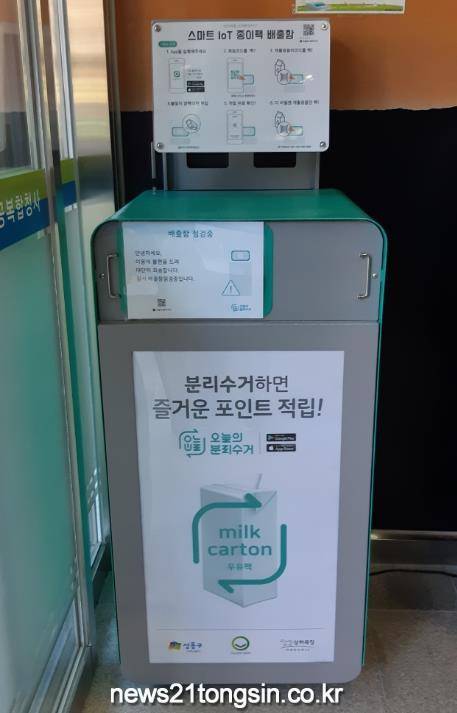 성동구(구청장 정원오)가 지난 14일부터 분리배출을 해야 자원으로 활용할 수 있는 종이팩 수거를 위해 ‘사물인터넷(IoT) 스마트 종이팩 수거함’을 시범 설치·운영한다고 밝혔다.