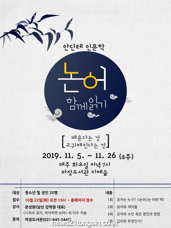 10월 22일 오전 10시부터 이천시통합도서관 홈페이지를 통해 참여자를 모집할 예정이며, 11월 5일부터 26일까지 오후 7시부터 9시까지 4주 동안 마장도서관 4층 지혜숲에서 운영된다.