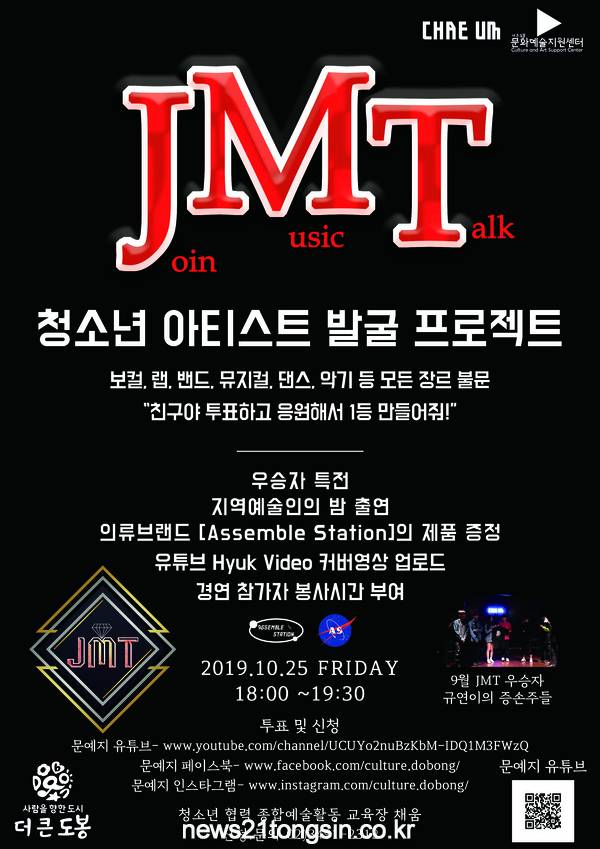 도봉구(구청장 이동진)는 오는 10월 25일 오후 6시 문화예술지원센터 주관으로 ‘JMT(Join Music Talk)’ 공연을 청소년 협력종합예술활동 교육장 채움(이하 ‘채움’)에서 개최한다.