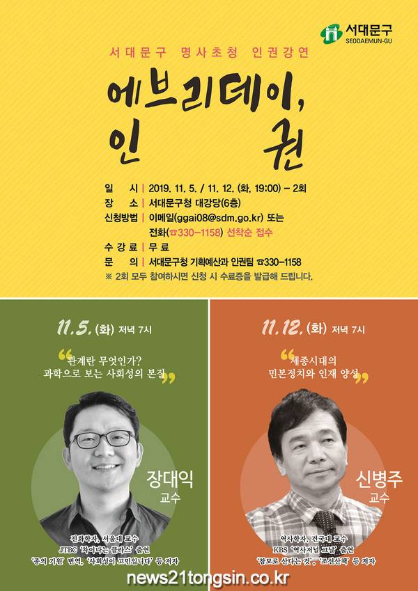 서대문구가 11월 5일과 12일 저녁 7∼9시 구청 6층 대강당에서 명사 초청 특강 ‘에브리데이, 인권! 인권을 꿈꾸다’를 개최한다.