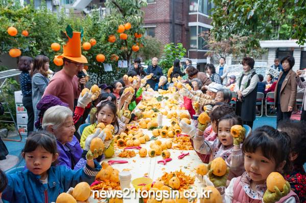 이 날 행사는 경로당 어르신과 어린이집 원생 등 100여 명이 참여해 어린이집 앞마당에 있는 감을 따고 직접 껍질을 깎은 뒤 바람이 잘통하는 서늘한 곳에서 말려 곶감을 만드는 과정으로 진행됐다.