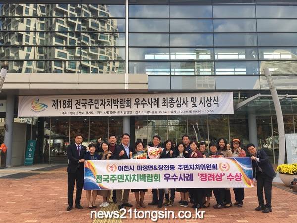 이천시는 29일 대전컨벤션센터에서 열린 제18회 전국주민자치박람회에서 마장면주민자치위원회와 창전동 주민자치위원회가 주민자치분야 및 지역활성화 분야에서 각각 장려상을 수상하며 우수사례에 선정되는 쾌거를 이루었다.