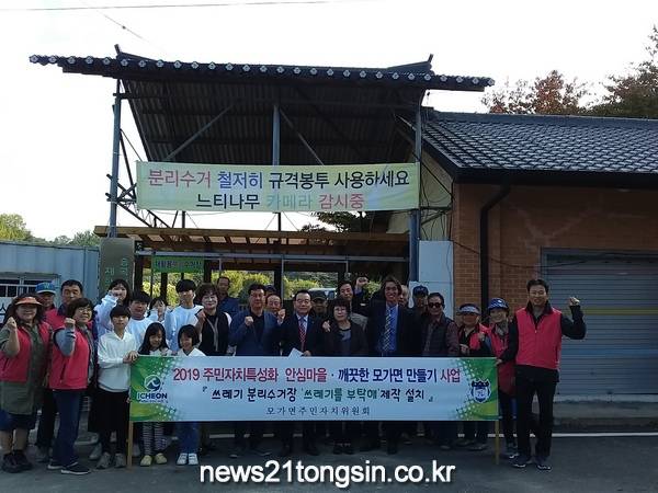 모가면주민자치위원회(위원장 권혁관)는 26일 2019년 주민자치특성화사업으로 모가면 어농3리, 소고1리, 송곡1리에 맞춤형 쓰레기 분리수거장을 제작 설치하고, 마을주민들과 함께 준공식을 가졌다.