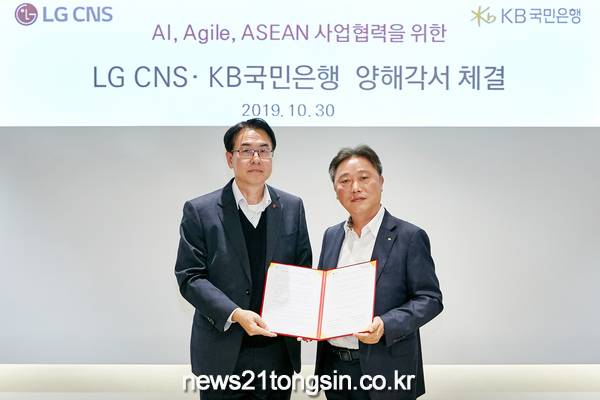 KB국민은행(은행장 허인)이 10월 30일 마곡 LG사이언스파크에서 LG CNS(사장 김영섭)와 신기술 기반 사업 협력을 위한 양해각서를 체결했다. 이날 열린 협약식에는 이우열 KB국민은행 IT그룹대표, 김홍근 LG CNS 금융/공공사업부장(전무) 및 양사 관계자들이 참석했다.