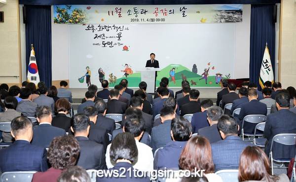 원희룡 지사는 이날 오전 제주도청 4층 탐라홀에서 열린 ‘11월 소통과 공감의 날’에 참석해 공직자들에게 올해 재정집행 90% 달성 및 내년 예산안 편성에 만전을 기해줄 것을 지시했다.