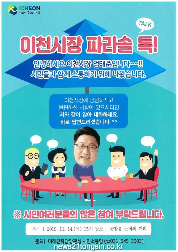 시민과 진정한 소통을 하기 위해 엄태준 시장이 시민들이 많이 찾는 장소에 직접 찾아 나가 자유롭게 대화하고 시민들의 다양한 의견과 생각을 시정에 적극 반영하고자 기획된 ‘이천시장 파라솔 톡~!’은 지금까지 중앙통 문화의거리, 이천터미널, 설봉공원등 다양한 장소에서 운영됐다.