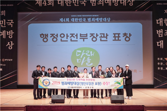 은평구 응암3동 다래마을 주민모임은 지난 6일 호암아트홀에서 열린 ‘제4회 대한민국 범죄예방대상’에서 은평구, 서부경찰서와 협업을 통해 범죄에 안전한 마을 환경조성을 위한 활동을 지속적으로 추진한 공로를 인정받아 종합우수부문 행정안전부장관 표창을 받았다.