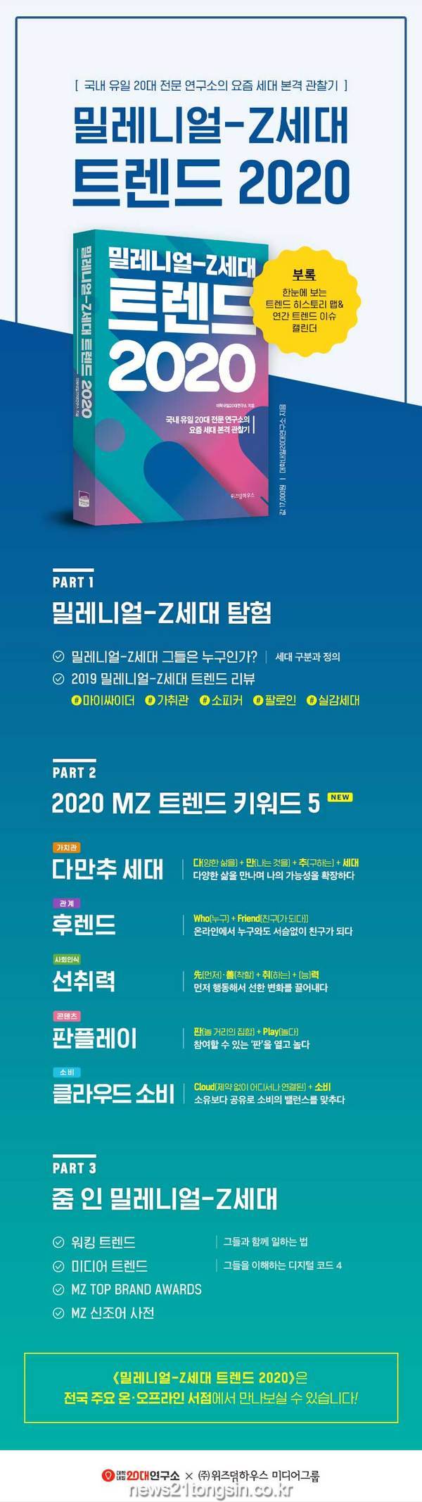 이번 <밀레니얼-Z세대 트렌드 2020>에는 밀레니얼-Z세대의 성향과 가치관을 꿰뚫은 다섯 가지 트렌드에 대한 분석뿐만 아니라 이를 바탕으로 과거와는 다른 직업관을 가진 밀레니얼-Z세대와 함께 일하는 법을 제시하는 ‘워킹 트렌드’, 디지털에 열광하는 밀레니얼-Z세대를 이해할 네 가지 코드를 소개하는 ‘미디어 트렌드’를 수록했다. 더불어 ‘혼내준다’, ‘찐’, ‘처돌이’ 등 이들이 일상에서 사용하는 21가지 신조어 등을 수록하여 이들의 변화상을 세부적으로 들여다볼 수 있도록 도왔다.