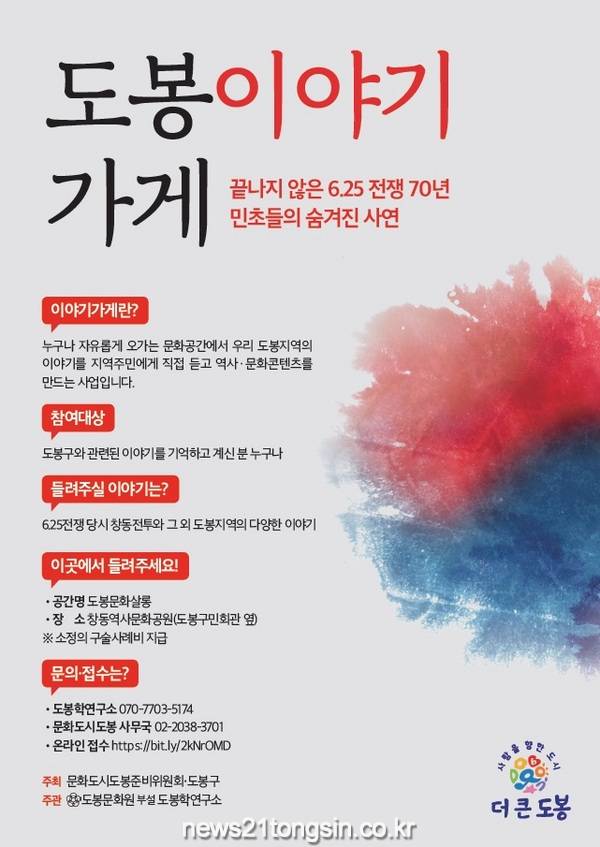 도봉구(구청장 이동진)가 주민들로부터 도봉구에서의 삶과 이야기를 수집하고 이를 자원화 새로운 지역문화 컨텐츠 사업으로 육성하기 위한 ‘도봉 이야기가게’를 운영한다.
