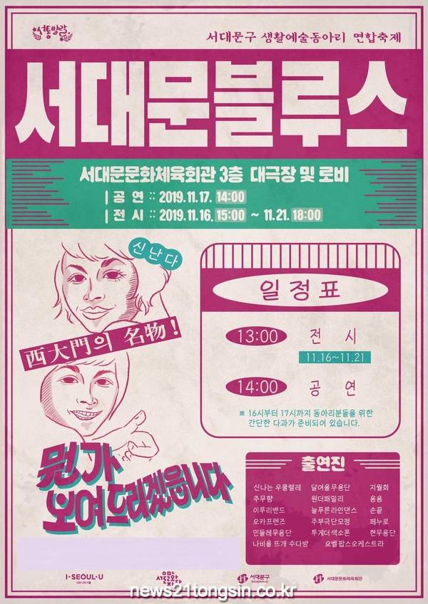 서대문구가 11월 17일 오후 2시 서대문문화체육회관 대극장과 로비에서 서대문 생활예술동아리 연합축제 ‘서대문블루스’를 개최한다.