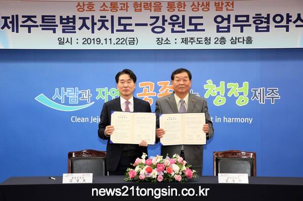 제주도는 오는 22일(금) 오후 6시 제주도청 삼다홀에서 김성언 정무부지사와 강원도 김성호 행정부지사가 참석한 가운데 제주도와 강원도의 상생 발전을 위한 업무협약을 체결하고 양 지방자치단체간 지역 경제 활성화 및 한반도 평화분위기 조성을 위한 교류협력을 확대한다고 밝혔다.