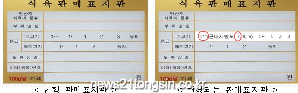 1++등급은 지방함량을 현행 17% 이상(근내지방도 8, 9번)에서 15.6% 이상(근내지방도 7, 8, 9번)으로 낮추고, 1+등급은 지방함량이 13∼17%(근내지방도 6, 7번)에서 12.3∼15.6%(근내지방도 6번)로 조정된다.