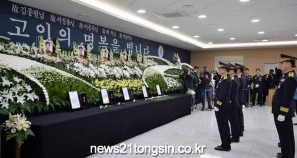 (대구 = 뉴스21통신/박창남기자) = 대구 달서구 계명대학교 동산병원 백합원에 마련된 독도 소방헬기 추락사고 순직 중앙119구조본부 소속 소방항공대원의 합동분향소에 대구지방경찰청 소속 경찰관들이 조문하고 있다.