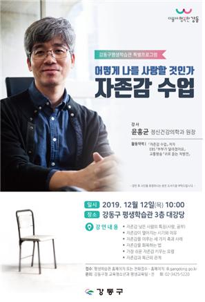 강동구(구청장 이정훈)가 12월 12일 오전 10시 강동구평생학습관(강동구 구천면로 395, 명일동)에서 ‘윤홍균의 자존감 수업’ 특강을 개최한다.