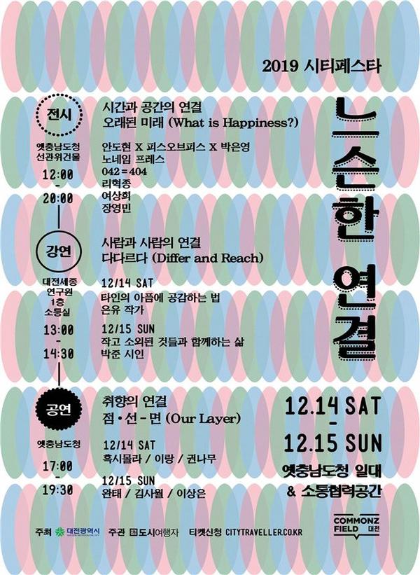 ‘지역거점별 소통협력공간(COMMONZ FIELD 대전)조성 사업’의 일환으로 개최되는 ‘2019 시티페스타 : 느슨한 연결’은 시간과 공간, 사람, 취향의 연결을 통해 도시의 진정한 행복을 꿈꾸는 삶이라는 주제 아래 지속가능한 삶과 진정한 행복의 의미를 생각해보는 행사다.