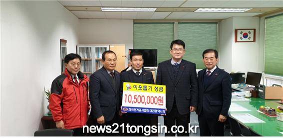 대전시는 지난 18일 오후 한국전기공사협회 대전광역시회(회장 고기배) 로부터‘불우이웃돕기 성금’1,050만원을 기탁 받았다고 19일 밝혔다.