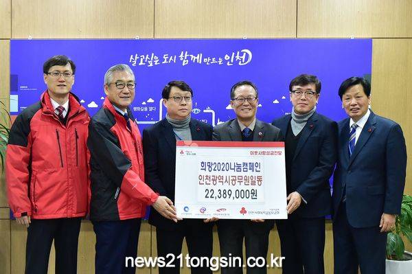 인천시(시장 박남춘)는 24일 직원들의 따뜻한 마음을 담은 사랑의 불우이웃돕기 성금(22,389,000원)을 인천사회복지공동모금회에 전달하였다.