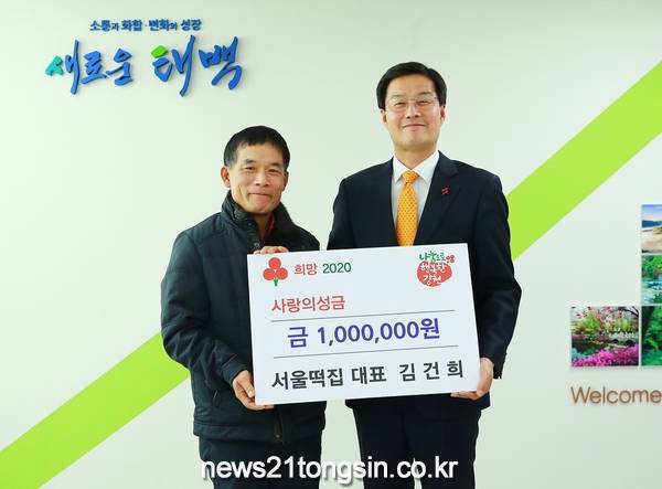서울떡집(대표 김건희) 김건희 대표가 23일(월) 태백시청을 방문, 이웃돕기 성금 1백만 원을 기탁했다.
