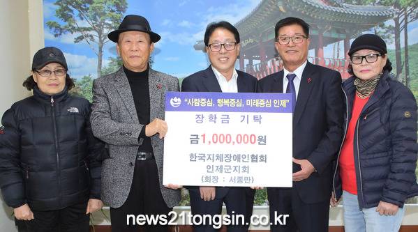 한국지체장애인협회 인제군지회(회장 서종만)는 24일 인제군청을 방문해 지역인재 양성을 위해 써달라며 100만원을 장학금으로 전달했다.