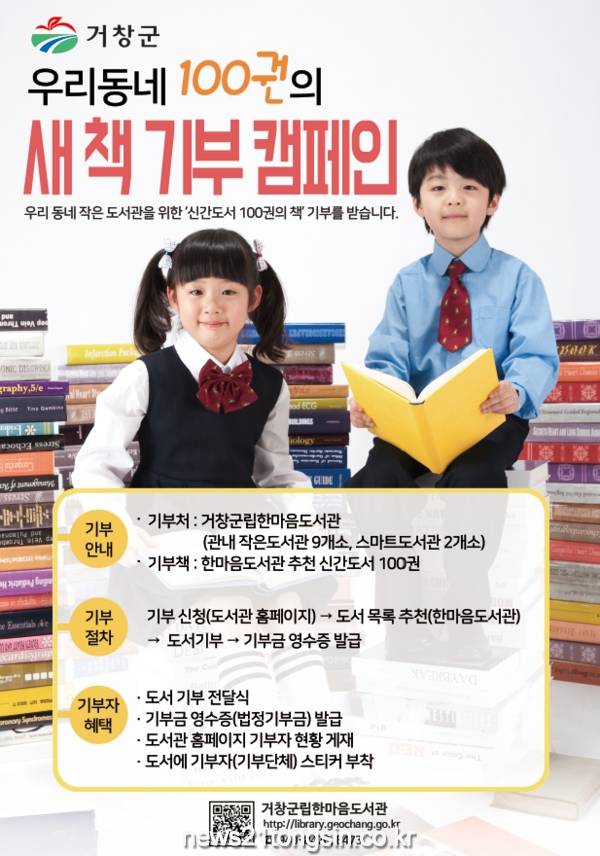거창군(군수 구인모)은 2020년 1월부터 관내 작은도서관(9개소)과 스마트도서관(2개소)을 지원하기 위해 ‘우리동네 100권의 새 책 기부 캠페인’을 펼친다.