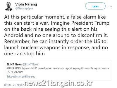 미구 매사추세츠공과대(MIT) 비핀 나랑 교수가 NHK의 오보를 비판했다.  비핀 교수느 자신의 SNS에 "지금 같은 특별한 시기에는 가짜 알람이 전쟁을 일으킬 수도 있다"며 "백나인(골프의 후반부)에 있던 도널드 트럼프 대통령이 이 경보를 보고 주변에서 아무도 의심하지 않았다고 상상해 보라. 그는 즉각 미국의 핵무기 발사를 명령할 수 있으며 아무도 그를 막을 수 없다"고 적었다.