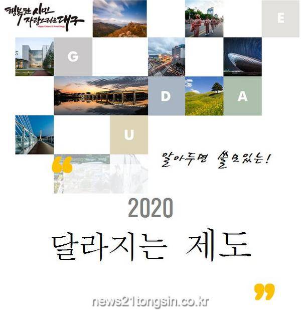 (대구=뉴스21통신) 유재원기자 = 대구시는 시민 편의를 제고하고, 시민홍보를 통한 제도․시책의 효과성을 높이고자, 2020년 경자년(庚子年) 새해부터 새로 시행되거나 바뀌는 제도 및 주요행사를 정리한 ‘2020년 달라지는 제도’를 시 홈페이지에 게시한다.