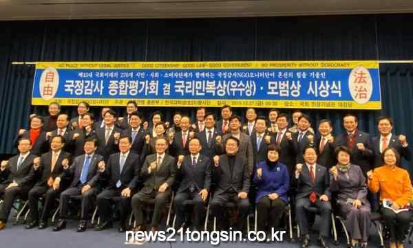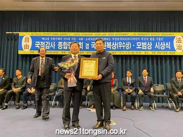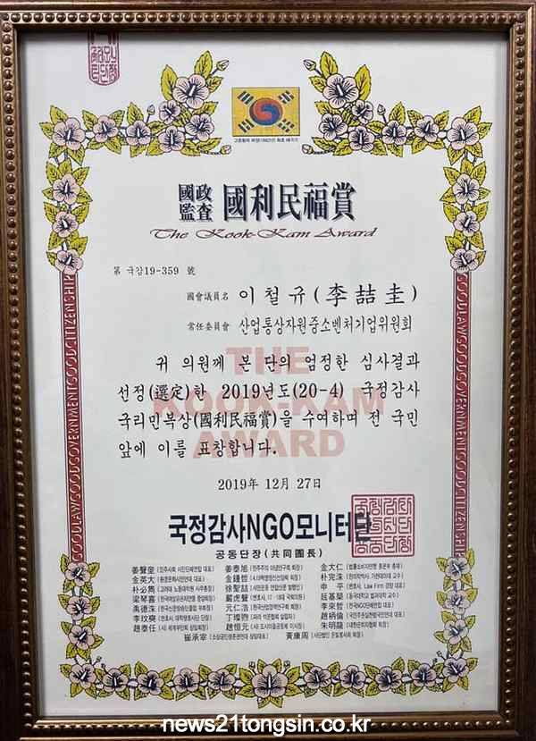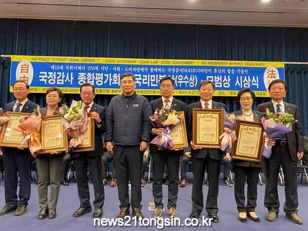 또한 의원은 지난 27일 "법률소비자연맹등 270여개 시민단체로 구성된 '국정감사 NGO 모니터단'으로 부터 '2019년도 국정감사 우수국회의원'으로 선정되어 국리민복상을 받았다"고 전했다.