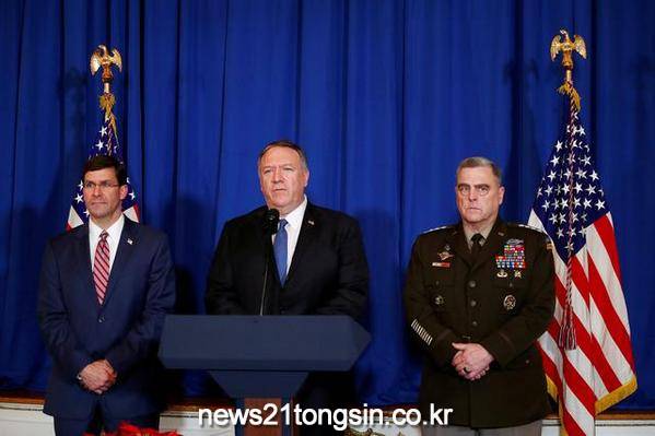 미국 국방장관이 29일(현지시간) 미 플로리다주 팜비치 소재 트럼프 대통령의 마러라고 리조트에서 마이크 폼페이오 미 국무장관과 함께 미군의 이라크와 시리아 공습과 관련해 성명을 발표하했다.