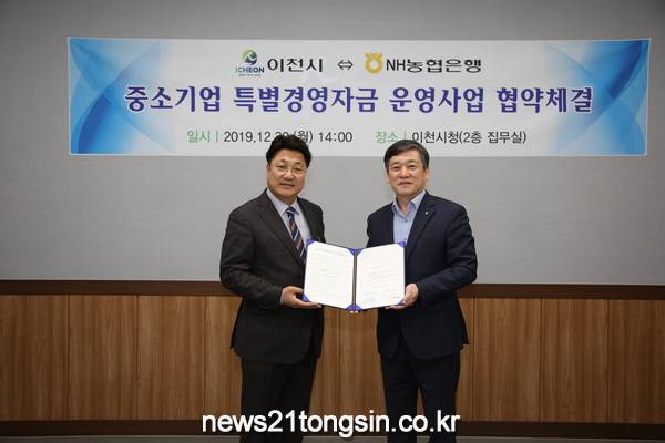 이천시(시장 엄태준)는 일본 정부의 수출 규제 및 경영애로 중소기업을 위해 30일 ‘중소기업 특별경영자금 융자지원 협약식’을 개최했다. 이천시와 NH농협은행 이천시지부가 협약을 통하여 추진하는 이번 사업은 관내 중소기업의 경영안정과 시설투자를 위해 시에서 50억 원, NH농협은행이 100억 원, 총 150억 원 규모로 기업 당 운전자금은 2억 원, 시설자금은 최대 5억 원까지 융자 지원한다.