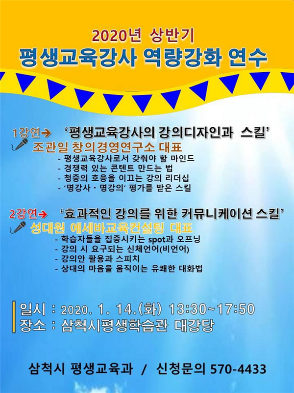 삼척시는 오는 1월 14일(화) 오후 1시 30분 평생학습관 대강당에서 『2020년 상반기 삼척시 평생교육강사 역량강화 연수』를 개최한다.