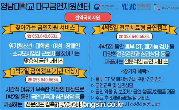 대구 금연지원센터에서는 금연지원서비스, 금연캠프를 실시하고 있다. 보건소 금연클리닉, 금연상담전화 등으로 금연이 어려운 흡연자 및 금연지원서비스 사각지대에 있는 대상자(위기청소년, 대학생, 여성, 장애인, 300인 미만의 소규모사업장 근로자)에게 찾아가는 금연지원서비스를 제공하고 있다.