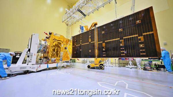 ▲ 태양전지판이 펼쳐진 천리안위성 2B호과학기술정보통신부(장관 최기영, 이하 ‘과기정통부’)와 환경부(장관 조명래), 해양수산부(장관 문성혁, 이하 ’해수부‘)는 ‘정지궤도복합위성 2B호(3.4톤급, 이하 ‘천리안위성 2B호’)’ 이송을 1월 5일(일)에 시작하였다고 밝혔다.