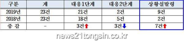 특히, 재난지점 인근 소방서까지 총 동원되는 대응단계 발령은 23건이며 재난초기 우세한 소방력을 집중 투입해 출동 선착대 및 119종합상황실의 선제적 대응단계 발령으로 대응2단계로 확대되는 재난이 전년대비 약 60%정도 감소됐다.