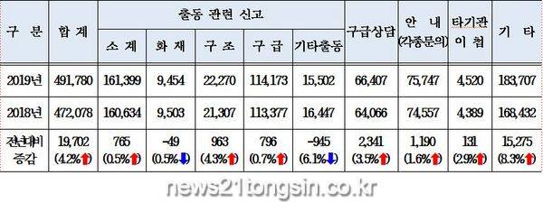 (대구=뉴스21통신) 유재원기자 = 대구소방안전본부가 2019년 119신고 접수 현황을 분석한 결과, 신고건수는 491,780건으로 전년 대비 4.2% 증가했고 재난신고 및 의료 안내 등이 큰 비중을 차지했다.
