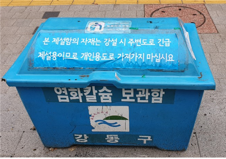 겨울철 눈길 사고 예방을 위해 제설함은 필수다. 폭설에 대비해 강동구의 고갯길, 이면도로 등 제설 취약구간에 설치된 제설함 246개소에는 염화칼슘, 소금, 삽 등이 보관돼 있다. 보행자가 많은 버스정류소, 지하철 역사 등 다중이용시설 33곳에는 넉가래, 빗자루, 제설 삽이 비치된 무료 제설 도구함도 있다.