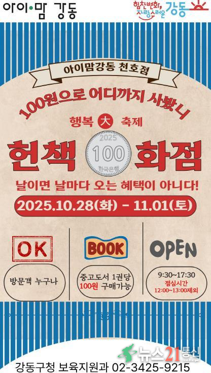 강동구(구청장 이수희)는 아이맘 강동 천호점 내 장난감 도서관에서 대여되었던 도서 중 상태가 양호한 책을 권당 100원에 판매하는 ‘헌책 100화점’ 행사를 개최한다고 27일 밝혔다.이번 행사는 11월을 맞아 아이맘 강동 천호점(상암로 168, 2층)에서 진행된다. 아이맘 강동 천호점은 쾌적한 이용환경 조성을 위한 바닥공사를 앞두고, 그.