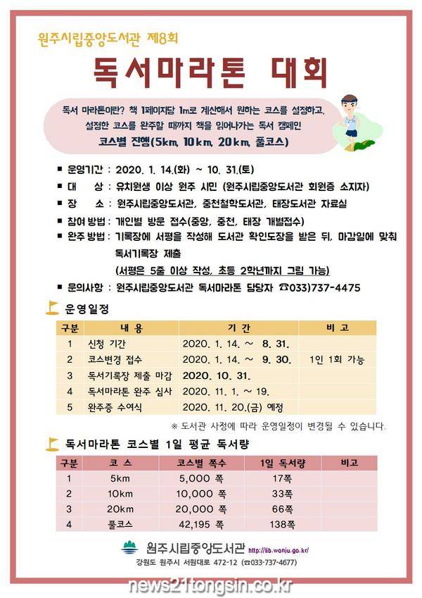 원주시립중앙도서관(관장 이한연)이 개최하는 제8회 독서마라톤 대회 참가자 접수가 1월 14일(화)부터 시작된다.