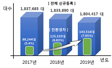 친환경자동차(전기, 수소, 하이브리드)는 총 601,048대로 전체에서 차지하는 비중이 ’18년 2.0%에서 ’19년 2.5%로 늘어나 친환경차의 점유율이 점차 증가하고 있음을 보여주고 있다.