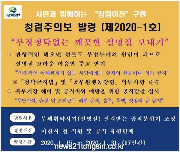 이천시(시장 엄태준)는 15일 설 명절을 맞아 관행적인 금품 및 향응수수 금지 등 공직기강 확립을 위해 이천시 전 직원 및 공직유관단체 직원을 대상으로 ‘청렴주의보’를 발령했다.