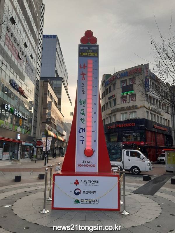 (대구=뉴스21통신) 유재원기자 = 대구가 58일 만에 ‘사랑의 온도’ 100도를 달성해 국채보상으로 대표되는 나눔의 명성을 이어갔다.