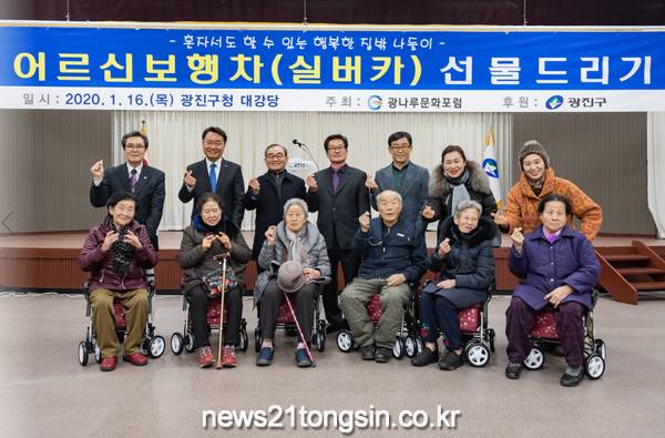 광진구(구청장 김선갑)가 16일 구청 대강당에서 어르신들을 위한 ‘보행차(실버카) 전달식’을 개최했다.