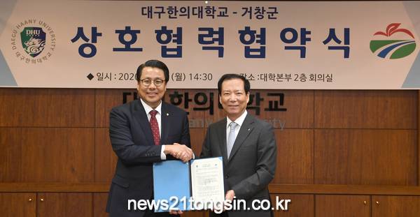거창군은 20일 대구한의대학교 회의실에서 대구한의대학교(총장 변창훈)와 상호협력 발전과 우호 증진을 위한 업무협약을 체결했다.