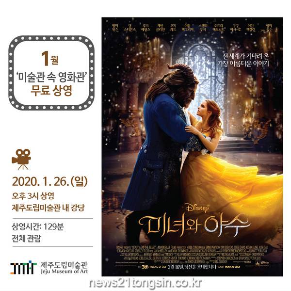 제주도립미술관(관장 최정주)은 1월 ‘미술관 속 영화관’ 상영 작품으로 <미녀와 야수>를 선정해 오는 26일 오후 3시에 제주도립미술관 강당에서 무료로 상영한다.