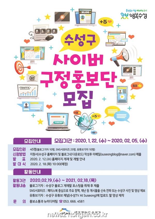 (대구=뉴스21통신) 유재원기자 = 대구 수성구는 톡톡 튀는 아이디어와 남다른 열정으로 구정의 다양한 소식을 전달할 ‘2020년 사이버 구정홍보단’을 모집한다.