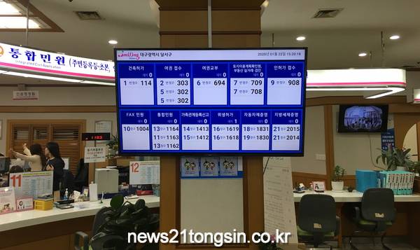 (대구 = 뉴스21통신) 박창남 기자 = 달서구청 홈페이지를 통해 민원 대기인수를 실시간으로 확인하고 붐비는 시간대를 피해 편리하게 구청 방문 일정 조정이 가능한 통합순번 대기시스템을 운영하여 주민들에게 좋은 반응을 얻고 있다고 밝혔다.