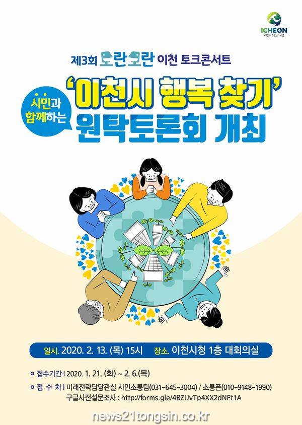 토론회 참여는 관내 소재의 직장인, 주부, 학생 등 이천시민으로서 ‘이천시 행복찾기’에 관심이 있는 시민은 누구나 참여 가능하며, 참가를 희망하는 시민은 다음달 6일까지 이천시청 시민소통팀(031-645-3002~5), 이천시민소통폰(010-9148-1990), 구글 사전설문(https://forms.gle/4BZUvTp4XX2dNFt1A)을 통하여 신청 할 수 있다.