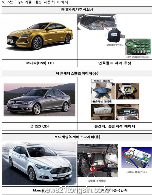 국토교통부(장관 김현미)는 현대자동차(주), 메르세데스-벤츠코리아(주), 포드세일즈서비스코리아(유)에서 수입 판매한 총 15개 차종 35,868대에서 제작결함이 발견되어 시정조치(리콜)한다고 밝혔다.