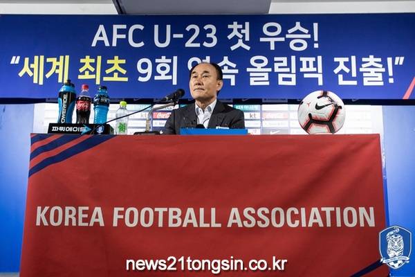 한국 U-23 남자대표팀의 김학범 감독이 30일 오전 축구회관에서 2020 AFC U-23 챔피언십 결산 기자회견을 가졌다. 사상 첫 AFC U-23 챔피언십 우승과 9회 연속 올림픽 본선 진출이라는 두 마리 토끼를 잡은 김학범 감독은 “우승은 감독으로서 영광이고 행복”이라면서 “무엇보다 이번 대회 우승을 통해 선수들에게 자신감을 많이 심어준 것 같다. 이 선수들에게 기회의 장을 열어준 게 큰 의미”라고 말했다.
