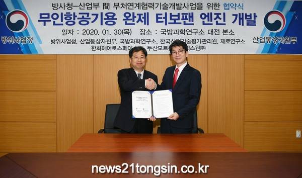 산업통상자원부와 방위사업청은 1.30.(목) 미래 국방 무인기용 고성능 “터보팬 엔진”의 성공적인 개발을 위해, 부처 협의체 구성 등의 내용을 포함한 업무협약(MoU)을 체결했다.